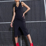 Black Rib Front Zipper Bodycon Midi Dress , in Rib fabric, Casual , Below Knee, Zipper Closure, Unlined , Slit At Front Hemline and features NA