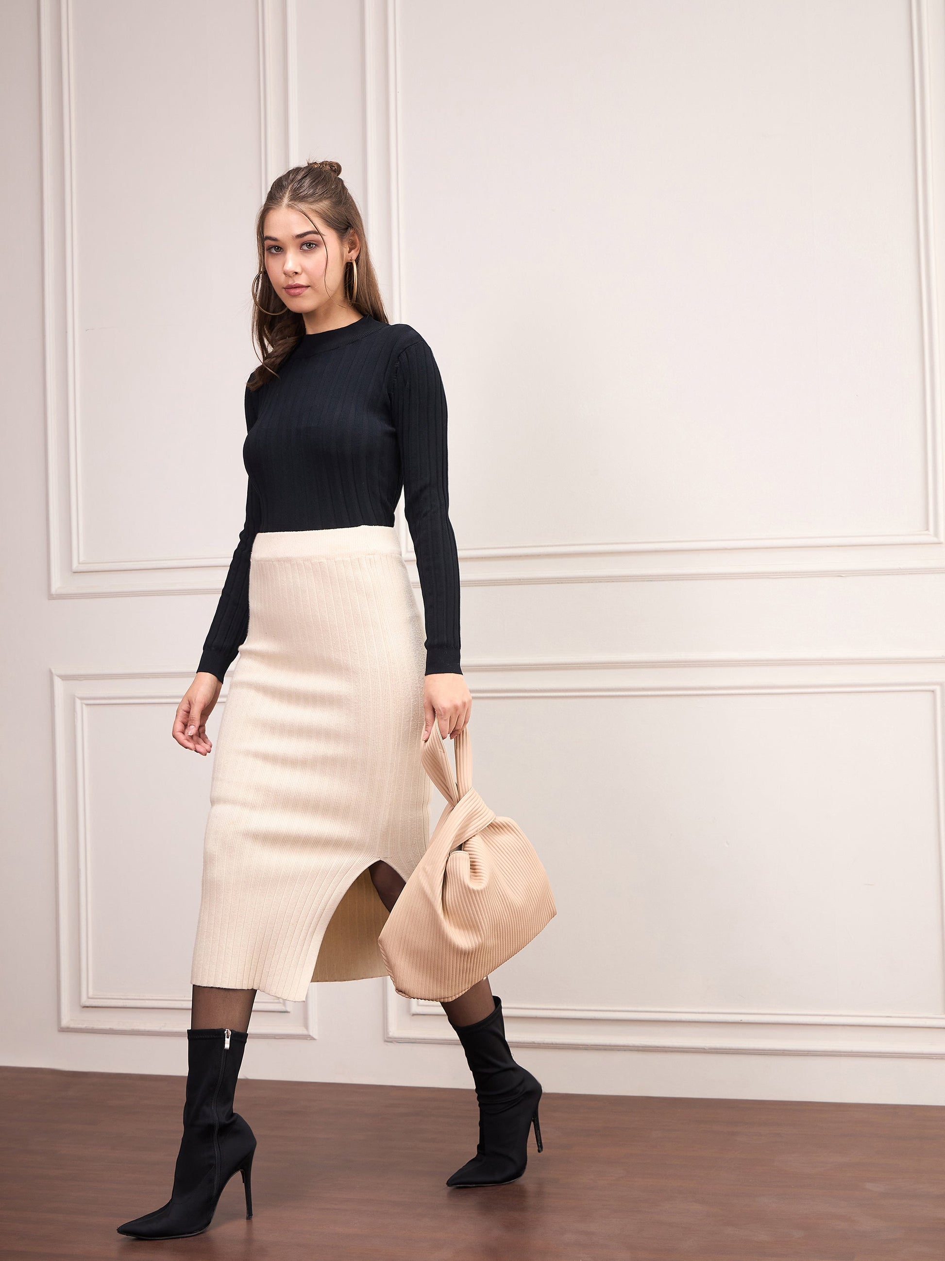 Black Rib Full Sleeves High Neck Sweater, in Viscose Nylon Rib fabric, Unlined, Regular Length, Slim Fit, No Closure, Straight Hemline and features Self Ribbed Design