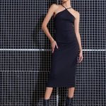 Black Rib Halter Neck Bodycon Midi Dress, in Rib fabric, Casual , Below Knee, No Closure, Unlined , Adjuster At Straps Hemline and features NA