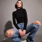 Black Rib High Neck Front Zipper Top, in Rib fabric, Unlined, Regular Length, Slim Fit, Zipper Closure, Straight Hemline and features Concealed Zip Detail At Neck