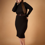 Black Rib High Neck Midi Dress, in Rib fabric, Unlined, Midi Length , Bodycon, Zipper Closure, Straight Hemline and features Golden Button Detail At Shoulder Side