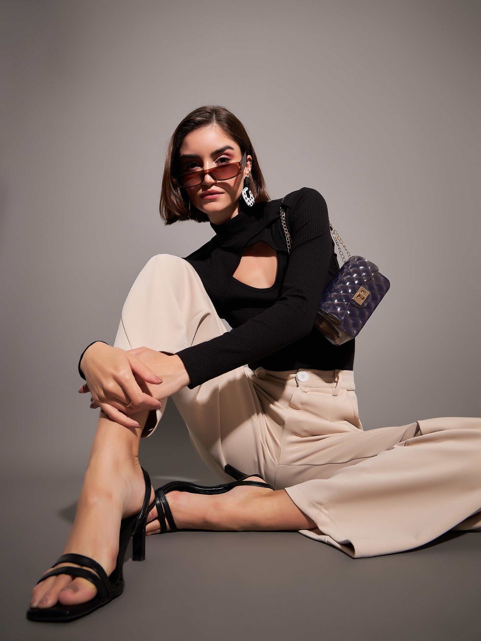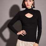 Black Rib Moon Cut Top, in Rib fabric, Unlined, Regular Length, Slim Fit, No Closure, Straight Hemline and features Cut Out Detail At Neck