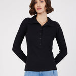 Black Rib Polo Neck Full Sleeves Top, in Rib fabric, Unlined, Regular Length, Slim Fit, Button Closure, Straight Hemline and features Slit At Side