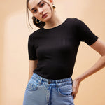 Black Rib Round Neck Bodysuit, in Rib fabric, Unlined, Regular Length, Slim Fit, Button Closure, Straight Hemline and features High Side Cut-outs