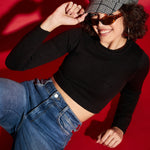 Women Black Rib Round Neck Full Sleeves Crop Sweater