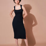 Black Rib Side Slit Bodycon Dress, in Rib fabric, Unlined, Midi Length, Slim Fit, No Closure, Straight Hemline and features Slit At Side