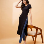 Black Rib Side Slit Longline Top, in Rib fabric, Unlined, Midi Length, Slim Fit, No Closure, Straight Hemline and features Side Slit Detail