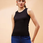 Black Rib Sleeveless Basic Top, in Rib fabric, Unlined, Regular Length, Slim Fit, No Closure, Straight Hemline and features Self Ribbed Pattern