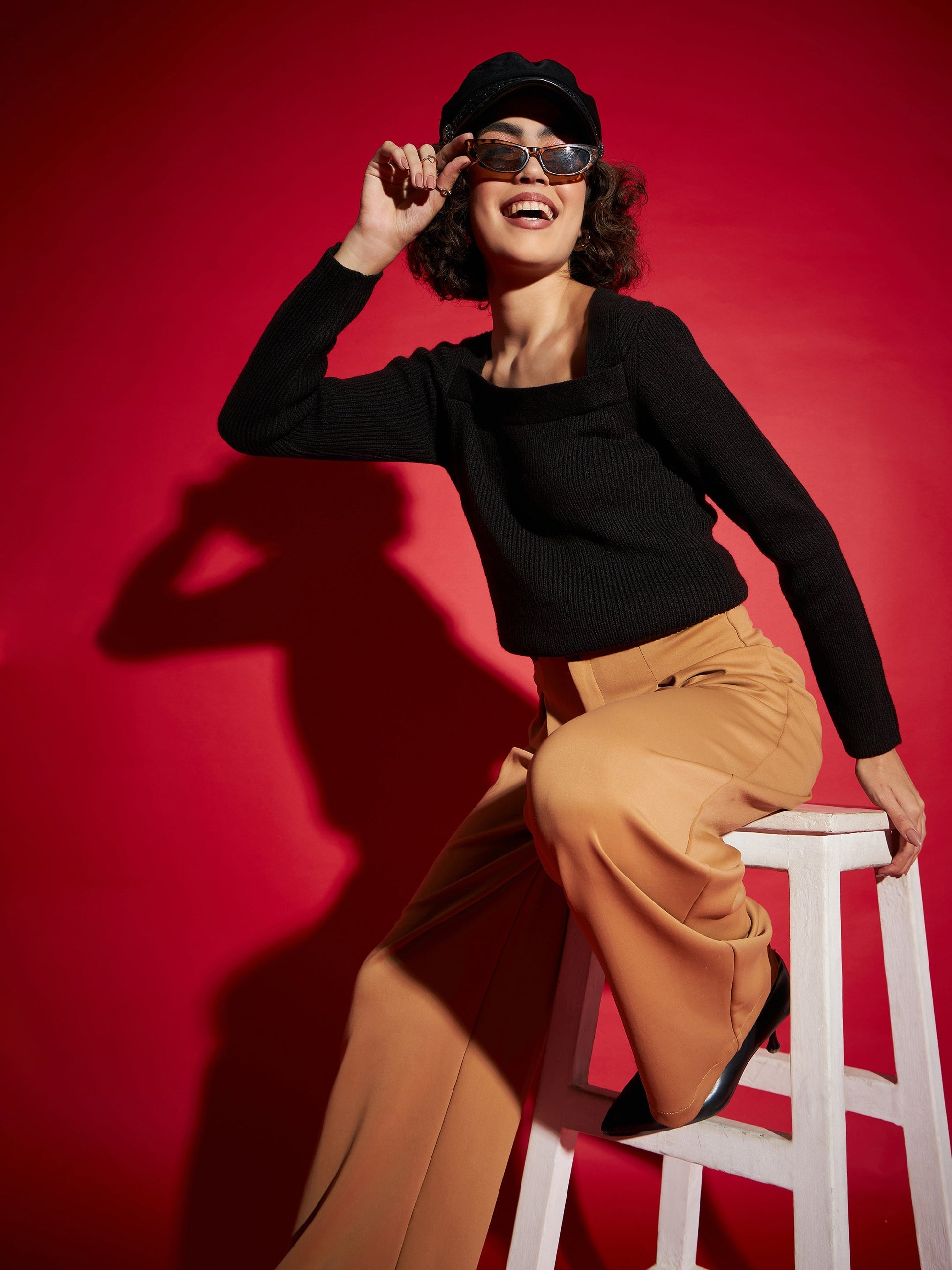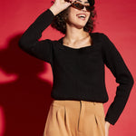 Black Rib Square Neck Full Sleeves Sweater, in Rib fabric, Unlined, Regular Length, Slim Fit, No Closure, Straight Hemline and features Square Neck Detail