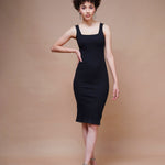 Black Rib Square Neck Midi Dress, in Rib fabric, Unlined, Below Knee, Slim Fit, No Closure, Straight Hemline and features Self Ribbed Pattern