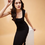 Black Rib Square Neck Midi Slit Dress, in Rib fabric, Unlined, Midi Length, Slim Fit, No Closure, Straight Hemline and features Side Slit Detail