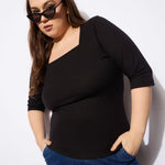 Black Rib Square Neck Top , in Rib fabric, Unlined, Regular Length , Comfort Fit , No Closure, Straight Hemline and features Self Design