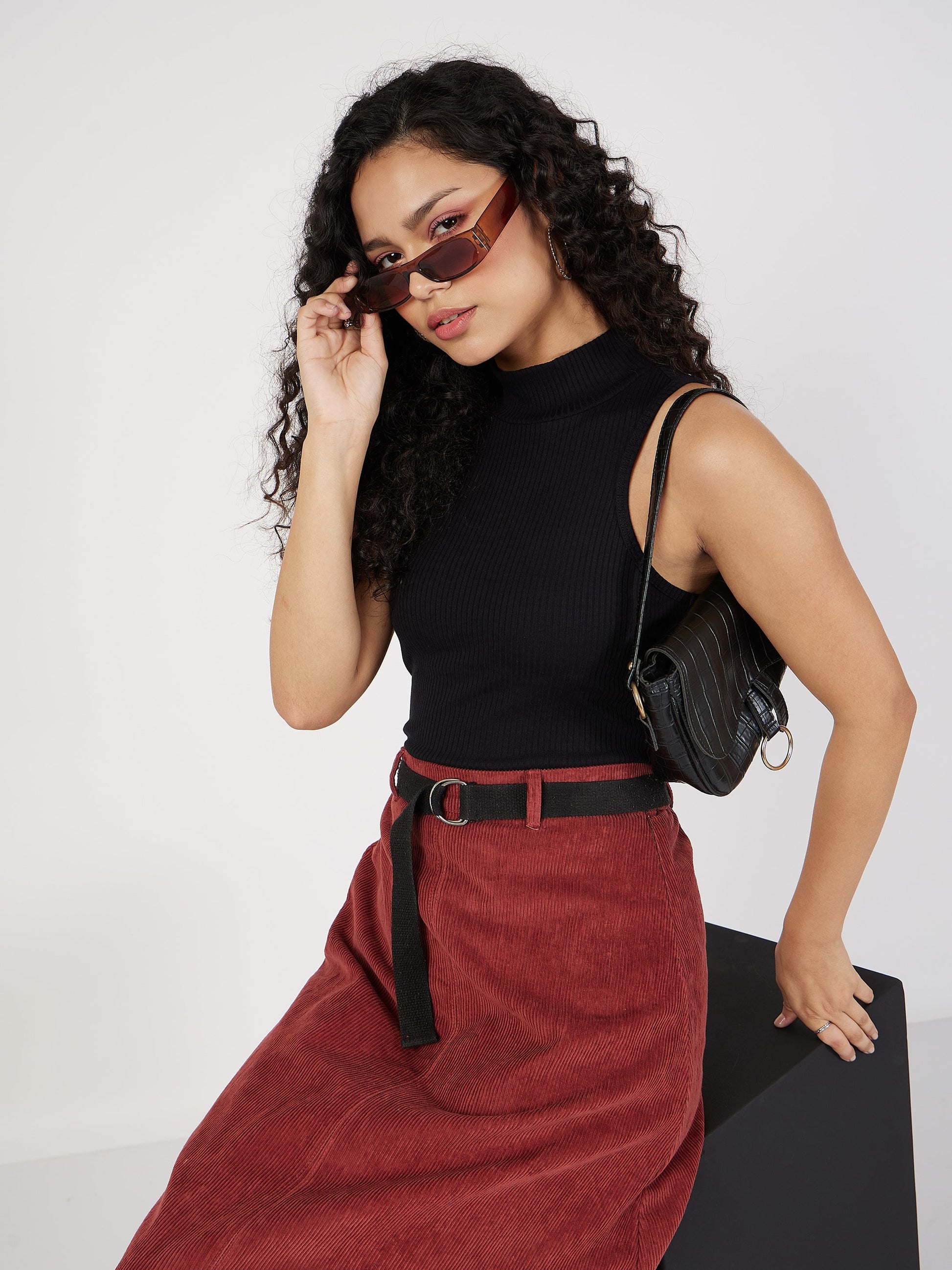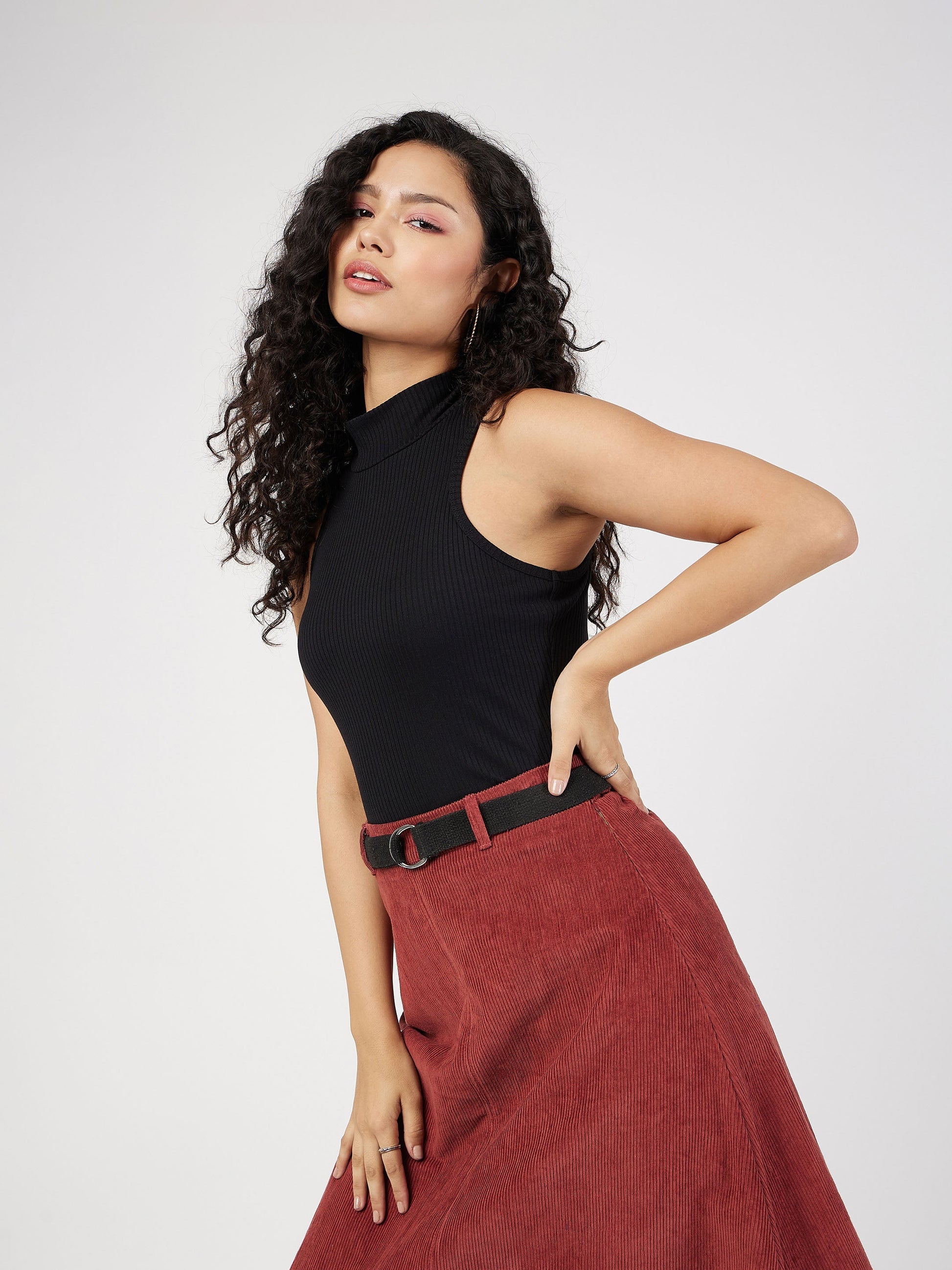 Black Rib Turtle Neck Sleeveless Top, in Rib fabric, Unlined, Regular Length, Slim Fit, No Closure, Straight Hemline and features Self Ribbed Design
