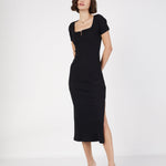 Black Rib V-Neck Midi Dress, in Rib fabric, Unlined, Below Knee, Slim Fit, No Closure, Straight Hemline and features Slit At Side