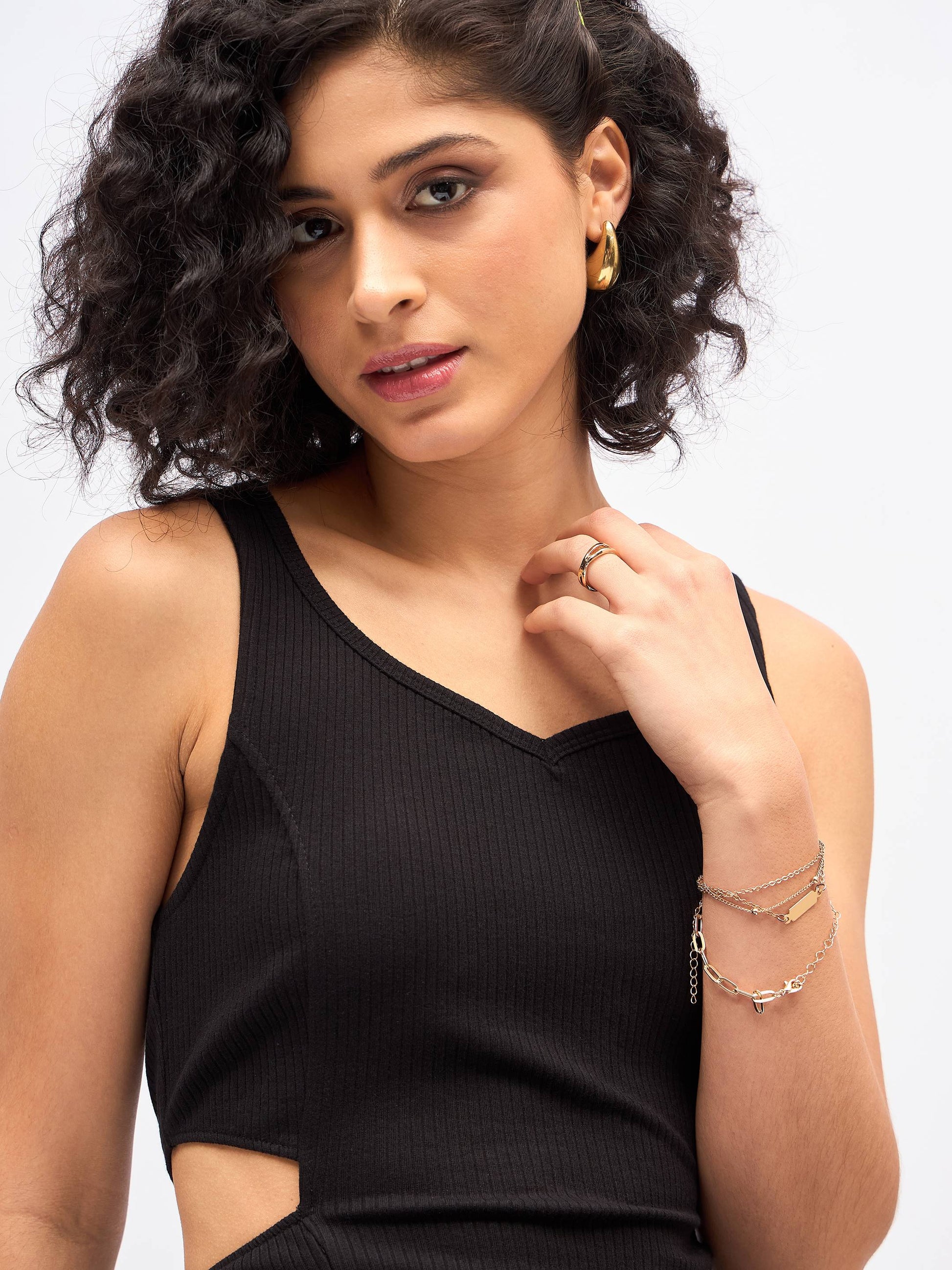 Black Rib Waist Cut-Out Midi Dress , in Rib fabric, Casual , Below Knee , No Closue, Unlined , Slit At Front Hemline and features NA