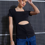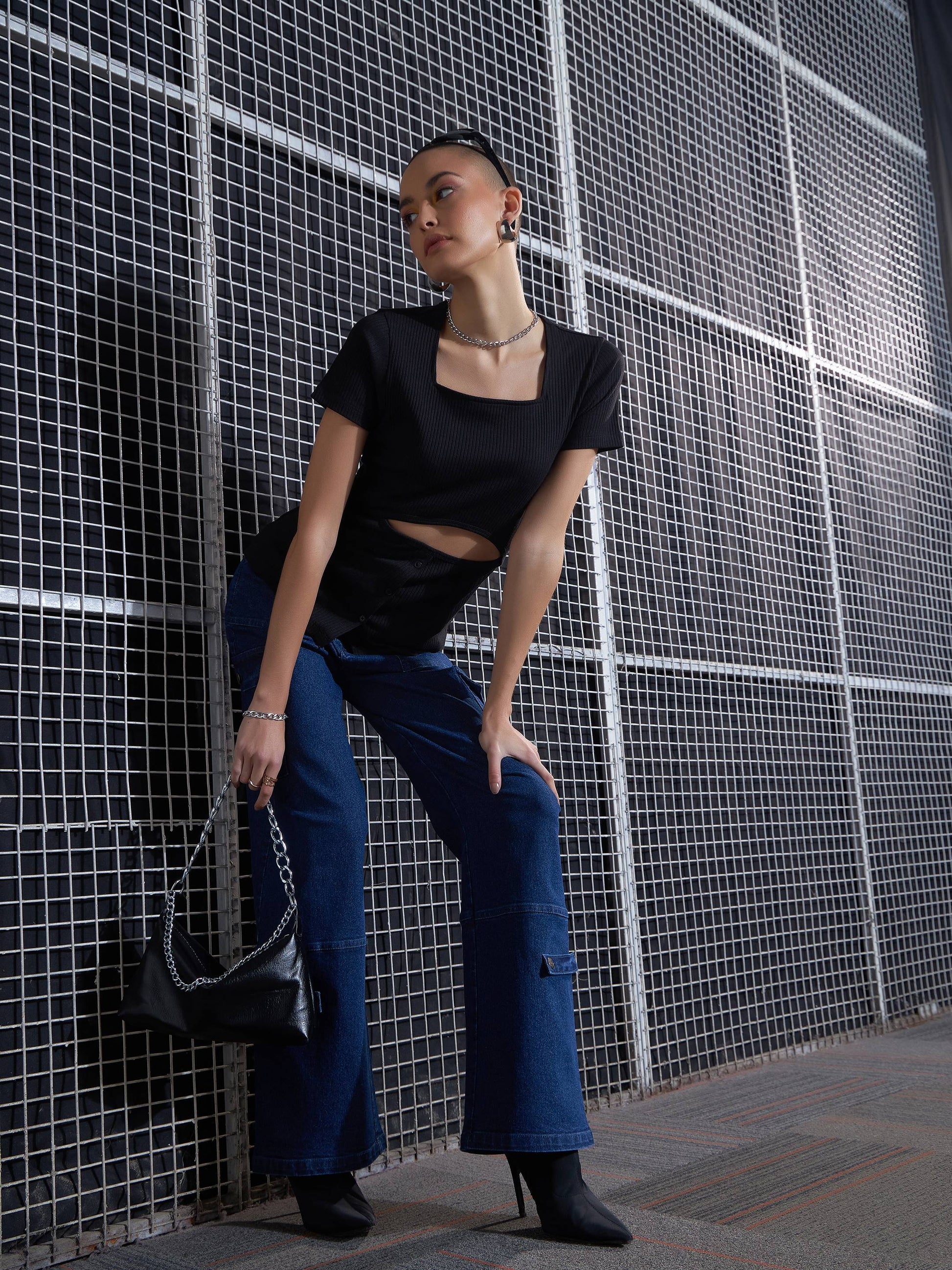 Black Rib Waist Cut-Out Top, in Rib fabric, Casual , Regular Length , Button Closure , Unlined , Button Detaile At Waist Hemline and features NA