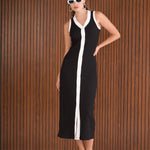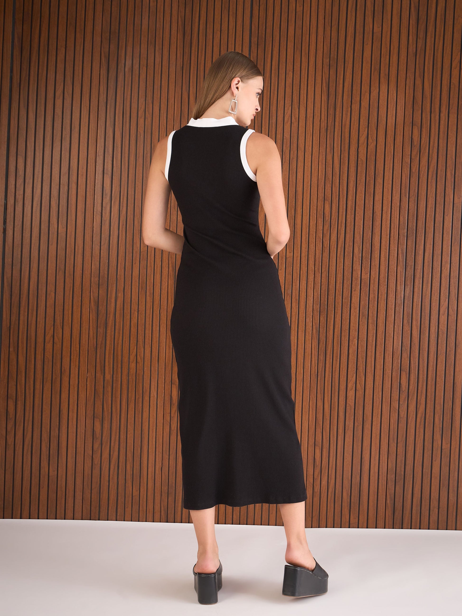 Black Rib With White Contrast Button Maxi Dress, in Rib fabric, Unlined, Maxi Length, Slim Fit, Button Closure, Straight Hemline and features Button Down At Front