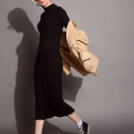 Black Ribbed Back Slit Full Sleeves Bodycon Dress, in Rib fabric, Unlined, Below Knee, Slim Fit, No Closure, Straight Hemline and features Side Slit
