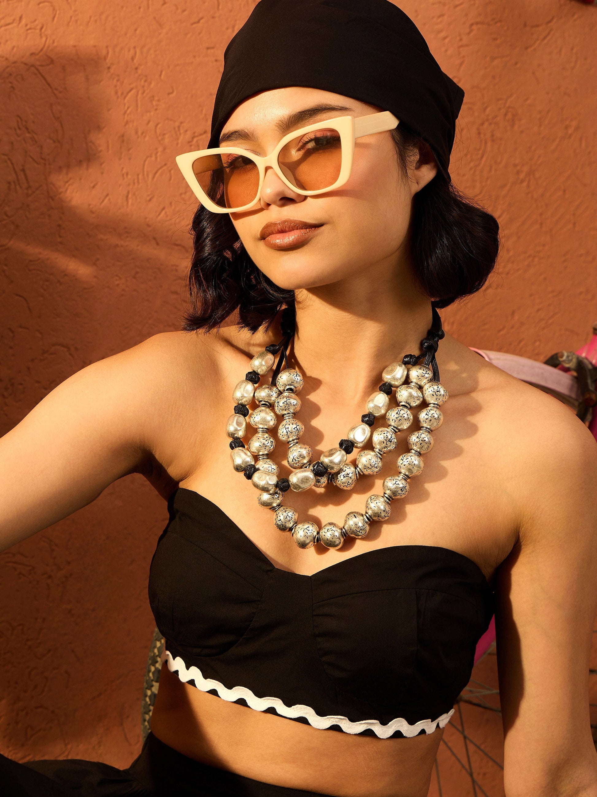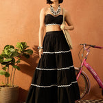 Black Ric Rac Lace Bustier Top With Tiered Skirt, in Cotton Poplin fabric, Unlined, Crop Length, Fit & Flare, No Closure, Straight Hemline and features Ric Rac Lace Detail