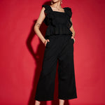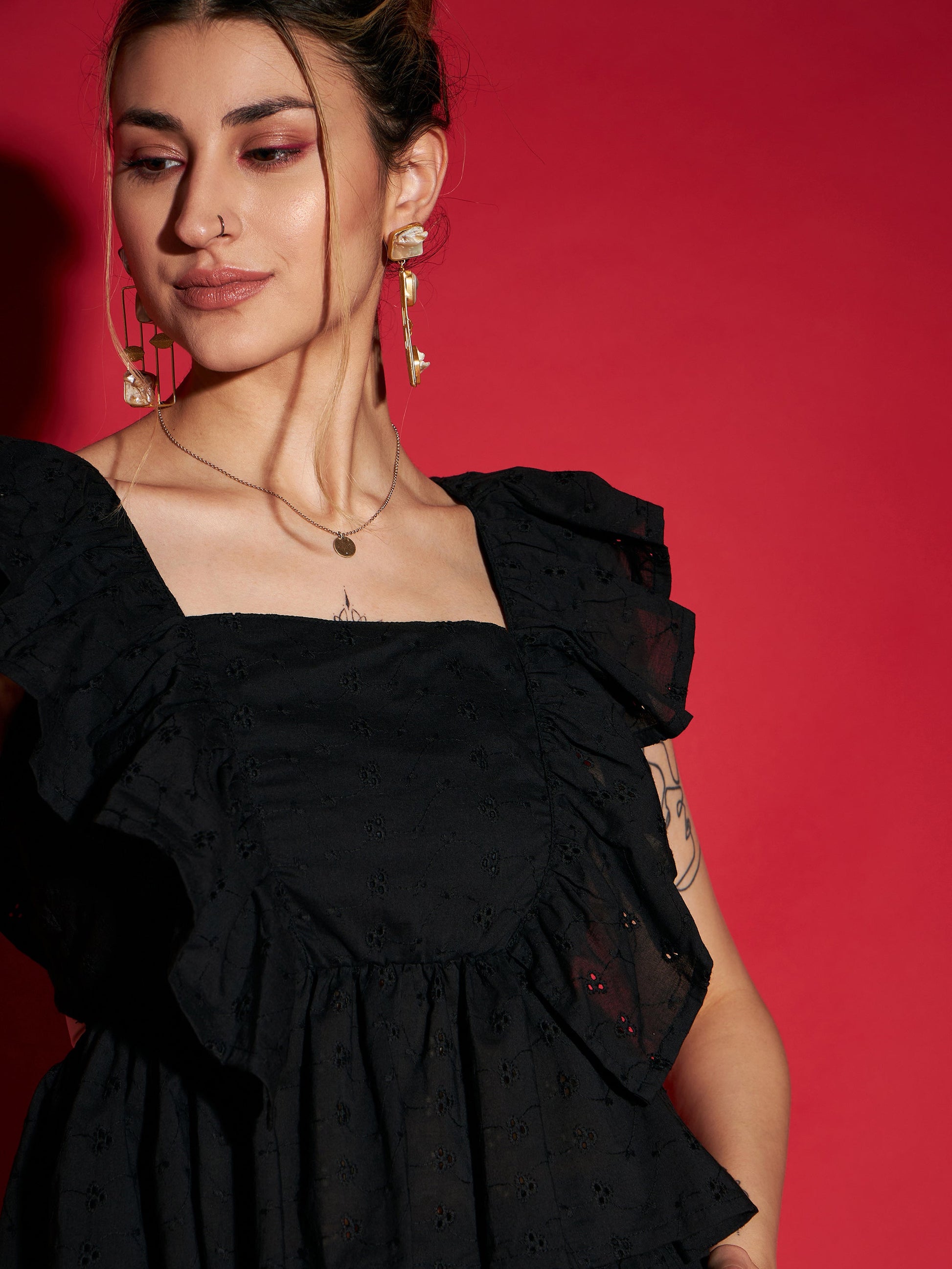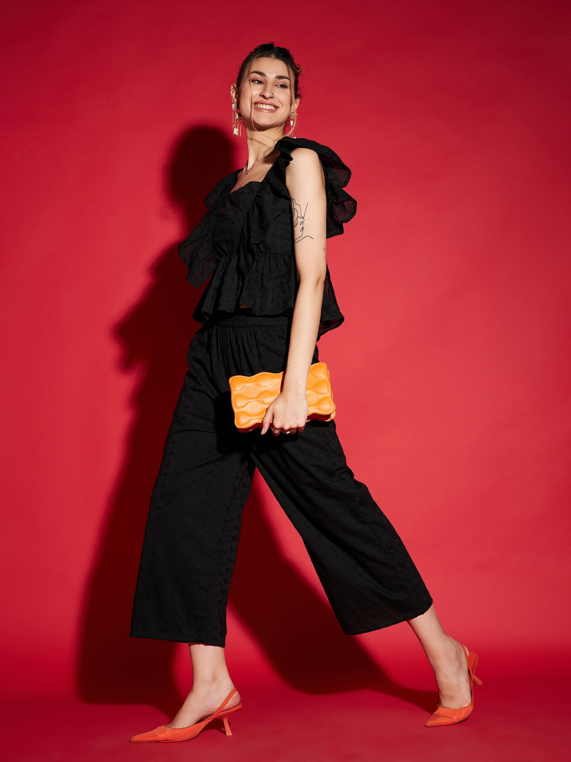 Black Schiffli Peplum Top With Palazzos, in Cotton Schiffli fabric, Cotton Voile, Regular Length, Regular Fit, No Closure, Flared Hemline and features Back tie Detail/Elasticated Waistband
