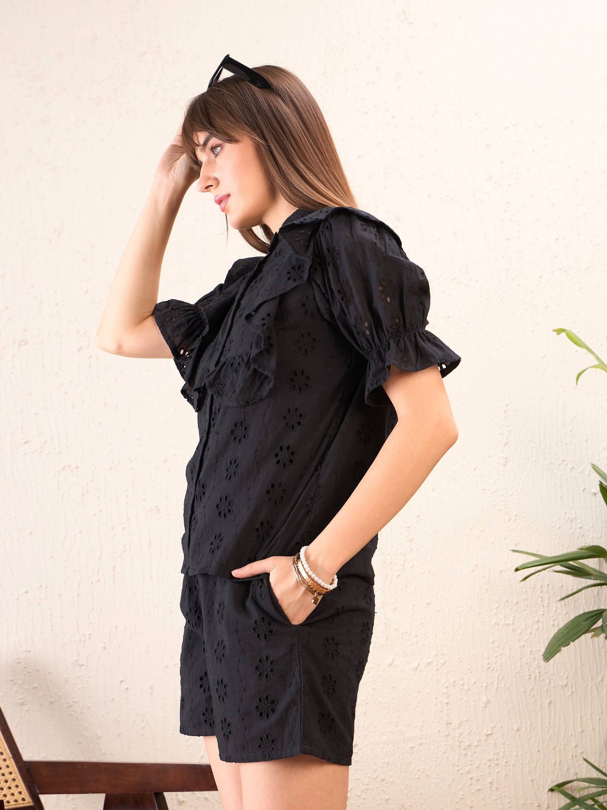 Black Schiffli Shirt With Paperwaist Shorts, in Cotton Schiffli fabric, Cotton Voile, Regular Length, Regular Fit, Button Closure, Straight Hemline and features Ruffle Detail At Front