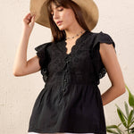 Black Schiffli V-Neck Peplum Top, in Cotton Schiffli fabric, Cotton Voile, Regular Length, Regular Fit, Button Closure, Straight Hemline and features Scallop Detail