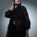 Black Sequin Shirt , in Sequin Georgette fabric, Unlined, Regular Length, Comfort Fit, Button Closure, Straight Hemline and features All Over Sequins Embroidery