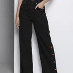 Black Side Button Placket Stretch Straight Jeans , in Denim fabric, Unlined, Full Length, Comfort Fit, Button Closure, Straight Hemline and features Button Placket Detail At One Side