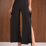 Black Side Slit Straight Fit Pants, in Marina fabric, Unlined, Regular Length, Straight Fit, Zipper Closure, Straight Hemline and features Ruffle Detail At Side Slit