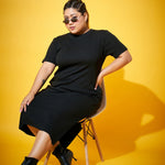 Black Side Slit Straight Midi Dress, in Rib fabric, Unlined, Midi Length, Straight Fit, , Straight Hemline and features Flap Pocket Detail At Front