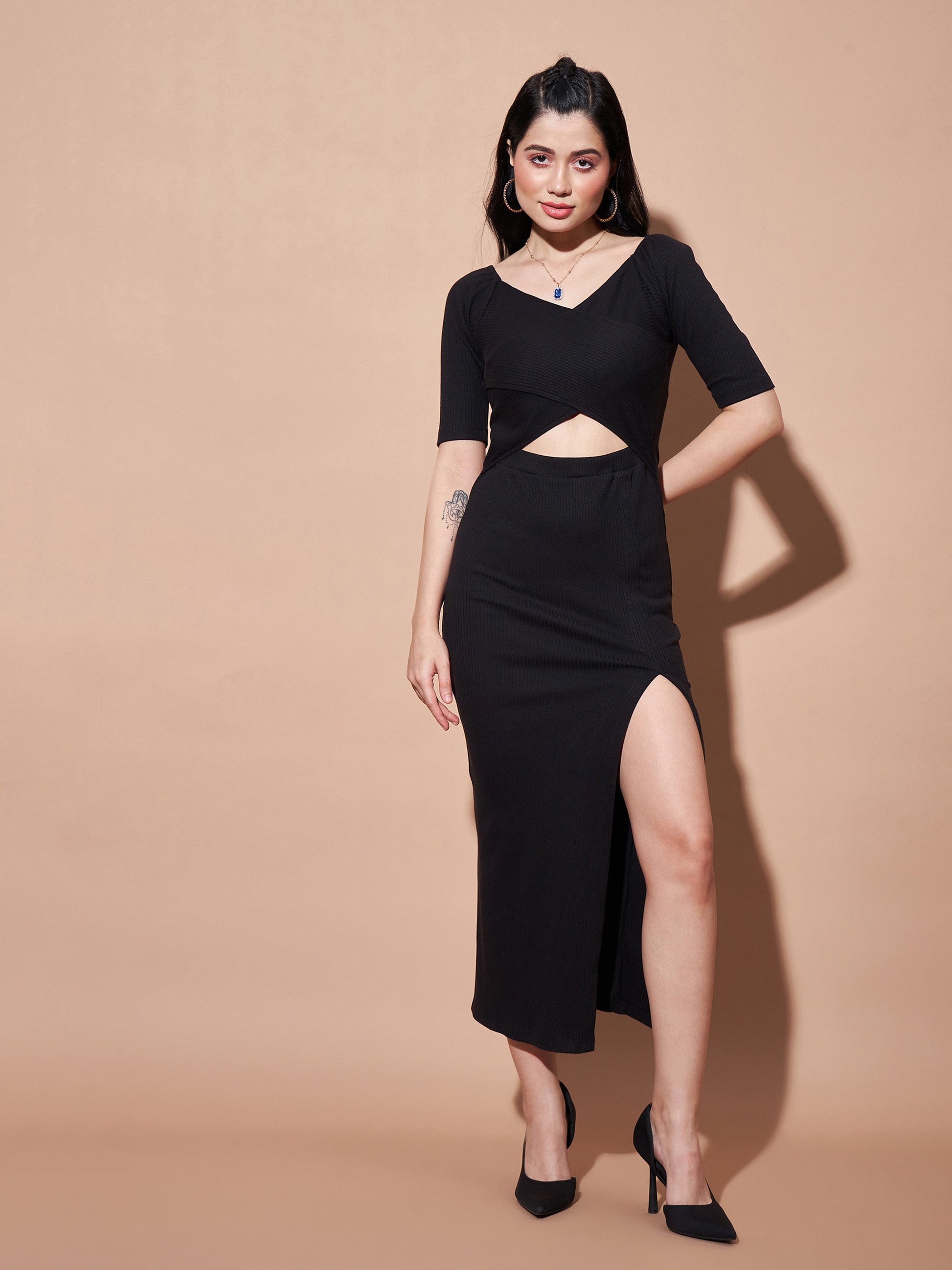 Black Side Slit V-Neck Rib Maxi Dress, in Cotton Rib fabric, Unlined, , Slim Fit , No Closure, Straight Hemline and features Cut Out Detail At Waist
