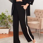 Black Side Tape Straight Pants, in Karera Crepe fabric, Unlined, Full Length, Comfort Fit, Button Closure, Straight Hemline and features Elastic Detail At Back Waist