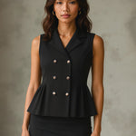 Black Sleeveless Notch Collar Button Top, in Canton fabric, Unlined, Regular Length, Regular Fit , Button Closure, Straight Hemline and features Button Detail