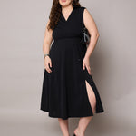 Black Sleeveless Side Slit Midi Dress, in Canton fabric, Unlined, Midi Length, Fit & Flare, Zipper Closure, Straight Hemline and features Wrap Neck Detail