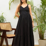 Black Sweatheart Neck Strappy Maxi Dress, in Schiffli fabric, Cotton Voile Lining, Maxi length, Fit & Flare, NA, Flared Hemline and features Smocking Detail At Back