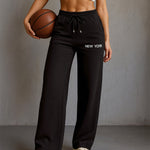 Black New York Print Wide Leg Terry Track Pants , in Terry fabric, NA, Full Length, Comfort Fit, Elasticated Waistline, Straight Hemline and features Line Art Print At Front On One Side