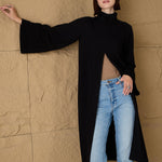 Black Turtle-Neck Front High Slit Sweater, in Flat Back Winter Rib fabric, Unlined, Below Knee, Comfort Fit, No Closure, Straight Hemline and features High Slit At Front
