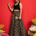 Women Black Velvet Crop Top With Jacquard Anarkali Skirt