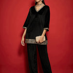 Women Black Velvet Emb V-Neck Short Kurta With Straight Pants