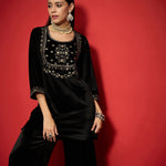 Women Black Velvet Embroidered Round Neck Short Kurta