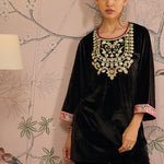 Black Velvet Embroidered Short Kurta , in Velvet fabric, Unlined, Regular Length , Comfort Fit, No Closure, Straight Hemline and features Embroidery Detail At Front