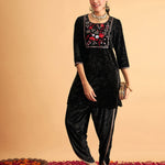 Women Black Velvet Embroidered Short Kurta With Dhoti Pants