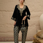 Black Velvet Embroidered Short Kurta With Farshi Salwar, in Velvet fabric, Cotton Lining, Regular Length , Comfort Fit, No Closure, Straight Hemline and features Embroidery Detail At Neck & Sleeves