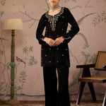 Women Black Velvet Embroidered Short Kurta With Straight Pants