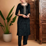 Black Velvet Embroidered Straight Kurta, in Velvet fabric, Unlined, Calf Length, Straight Fit, NA, Straight Hemline and features Pocket Detail At Side