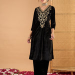 Women Black Velvet Embroidered Straight Kurta With Straight Pants