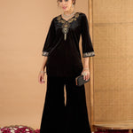 Women Black Velvet Embroidered V Neck Short Kurta With Palazzos