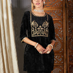 Black Velvet Embroidered Yoke Short Kurta, in Velvet fabric, Unlined, Above Knee, Comfort Fit, No Closure, Straight Hemline and features Chain Detail At Front
