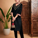 Women Black Velvet Embroidered Yoke Straight Kurta