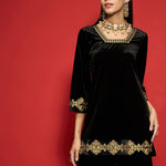 Women Black Velvet Front Embroidered Glass Neck Short Kurta